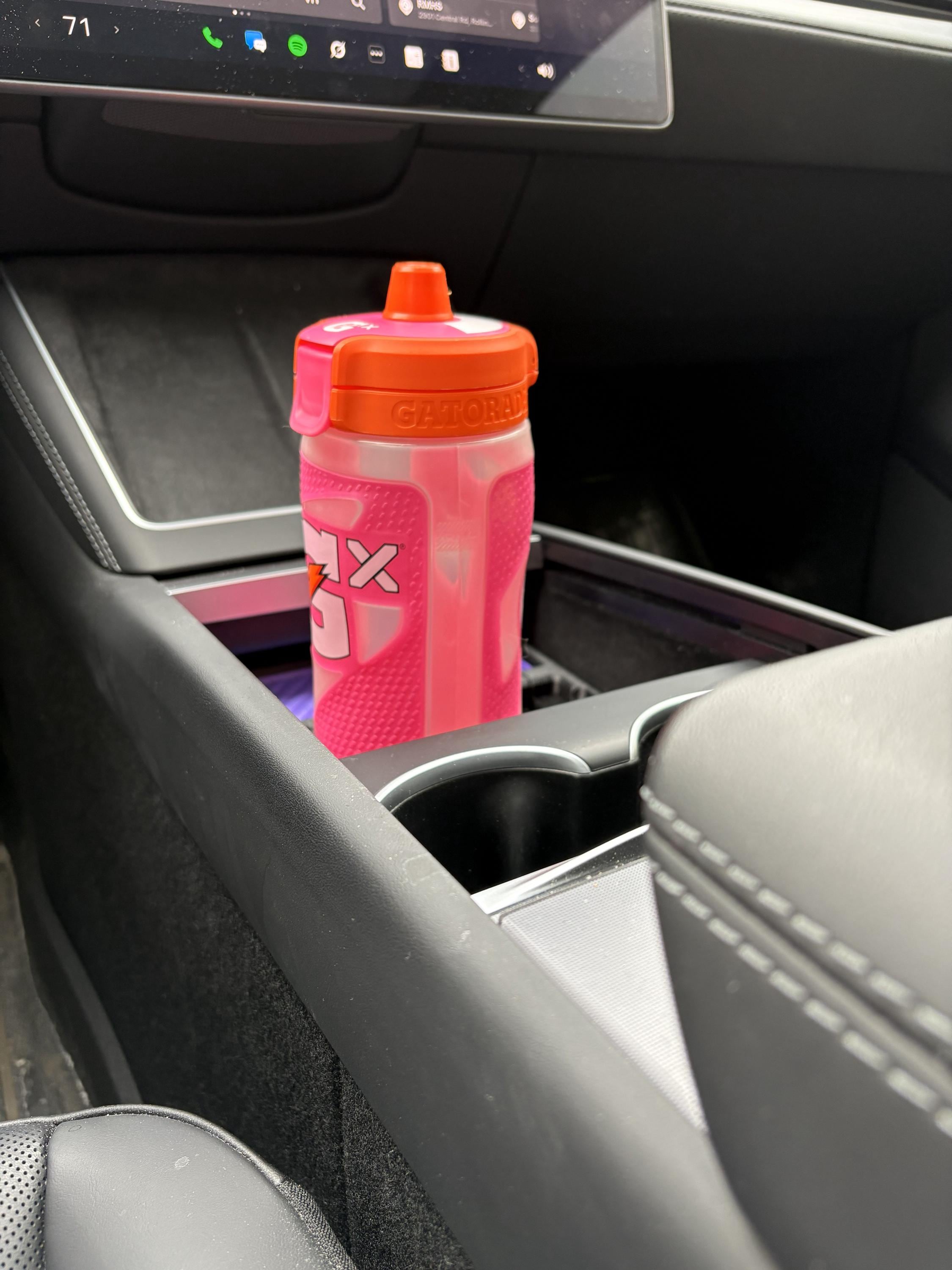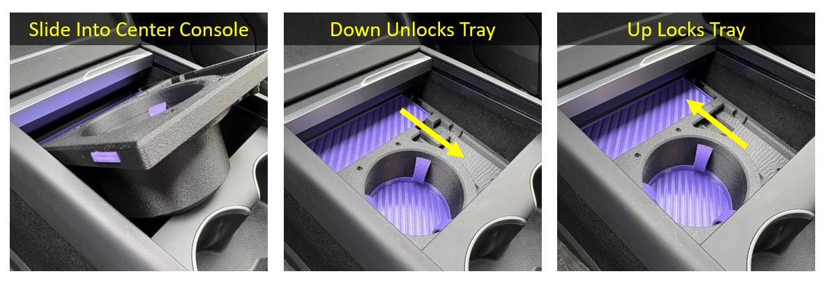 The center console tray insert with a cupholder pocket is the perfect accessory for the Tesla Model Y Juniper. Most holders can't use slight compression to keep the waterbottle from rattling around. This designs fixes it with a locking feature that keeps the tray in the right place and prevents it from pulling out when a bottle is removed. The rubberized inserts keep everything quiet during the drive as well.